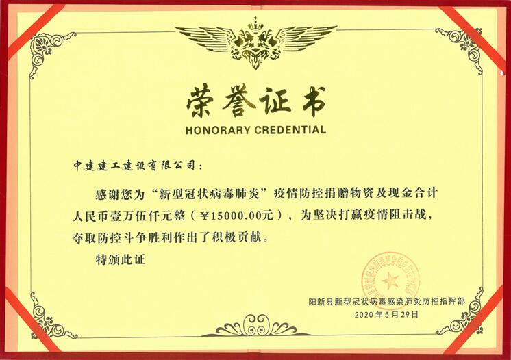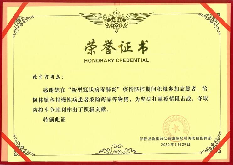 新型冠狀病毒肺炎志愿者榮譽證書